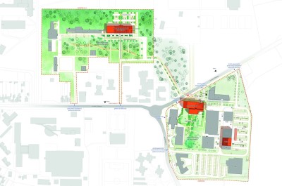 Le site de la CCI du Mans occupe deux vastes territoires de part et d’autre de la rue Henri Champion. L’un est très dense ; le projet consiste à déconstruire, construire compact pour retrouver de la pleine terre et développer un projet paysager d’envergure avec des espaces extérieurs collectifs appropriables. L’autre est peu dense et très boisé ; le projet consiste à construire compact pour préserver le caractère naturel du site, avec également la création espaces extérieurs appropriables pour les étudiants. Chaque fois, les parcours piétonniers sont repensés et de nombreux stationnement deux-roues sont créés.